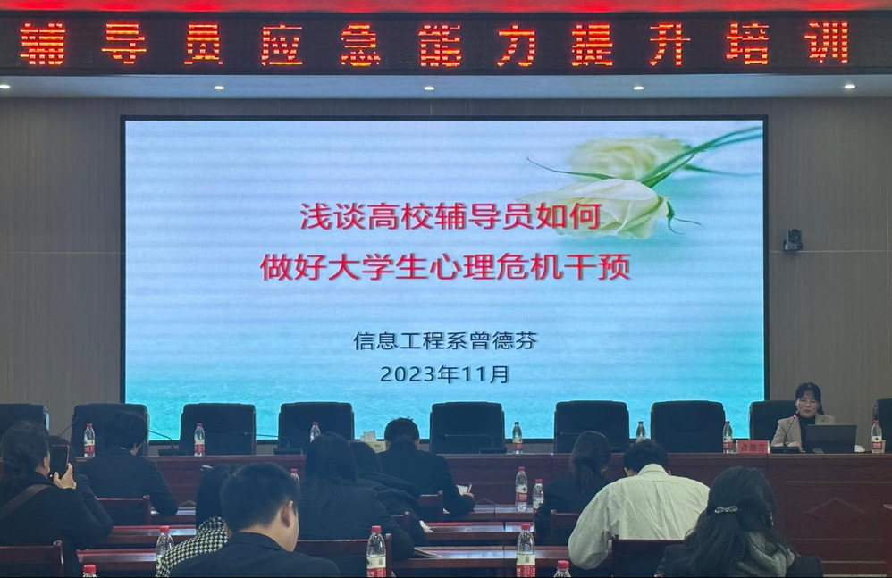 信息工程系党总支负责人曾德芬给大家上了一堂以《浅谈高校辅导员如何做好大学生心理危机干预》为题的培训讲座,指出辅导员作为学生心理的预防者、协助者和关注者,要积极搭建学生、学校、家庭的沟通桥梁,引导学生心理健康成长。