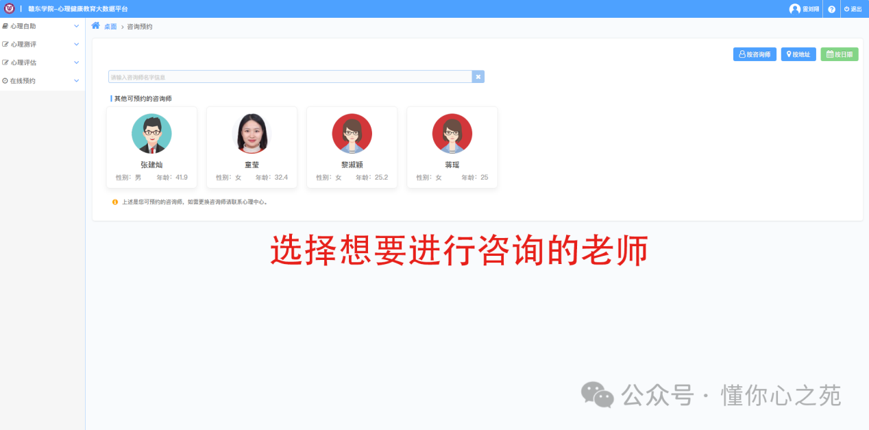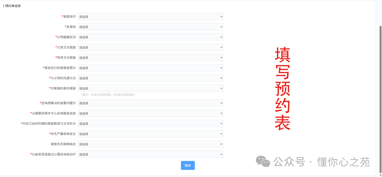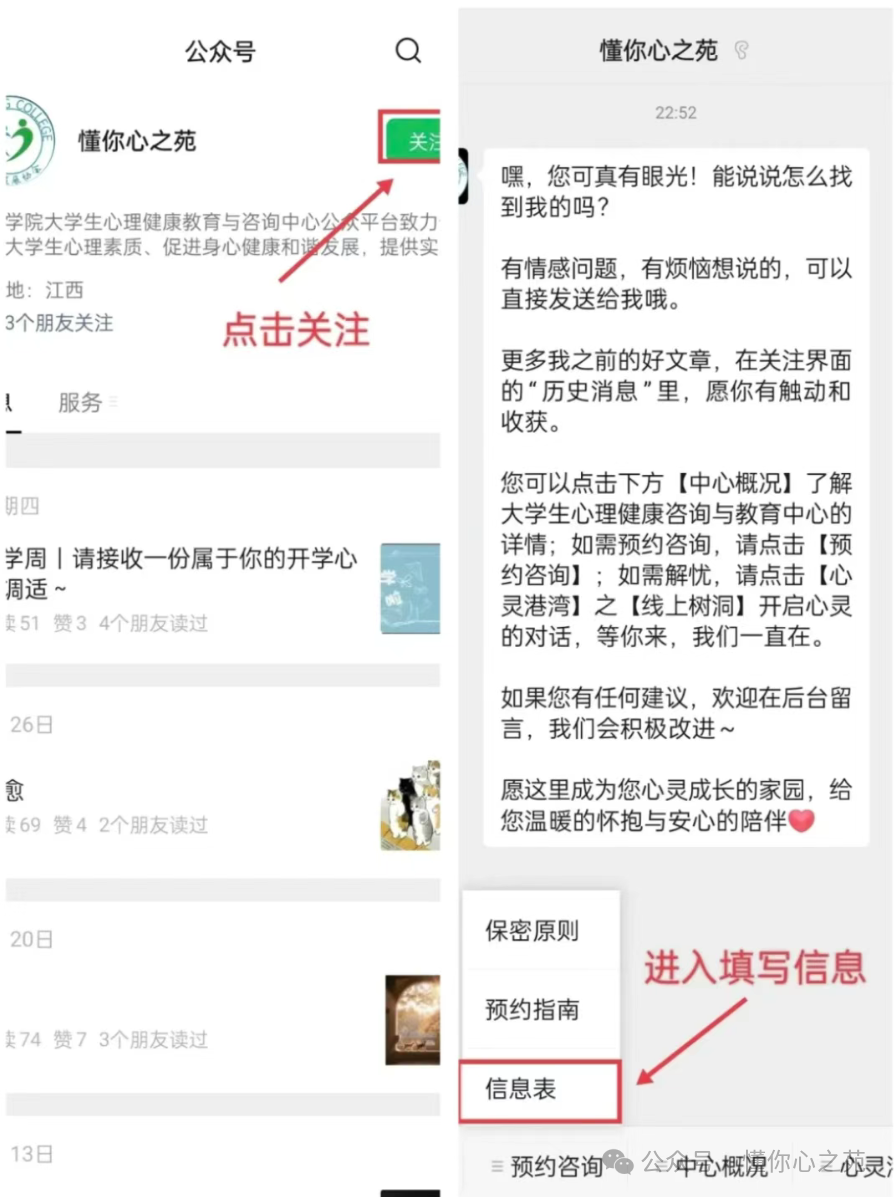 打开“赣东学院-心理健康教育大数据平台”根据流程提示完成预约。关注微信公众平台“懂你心之苑”,点击下方“预约咨询”再点击“信息表”填写相关信息。