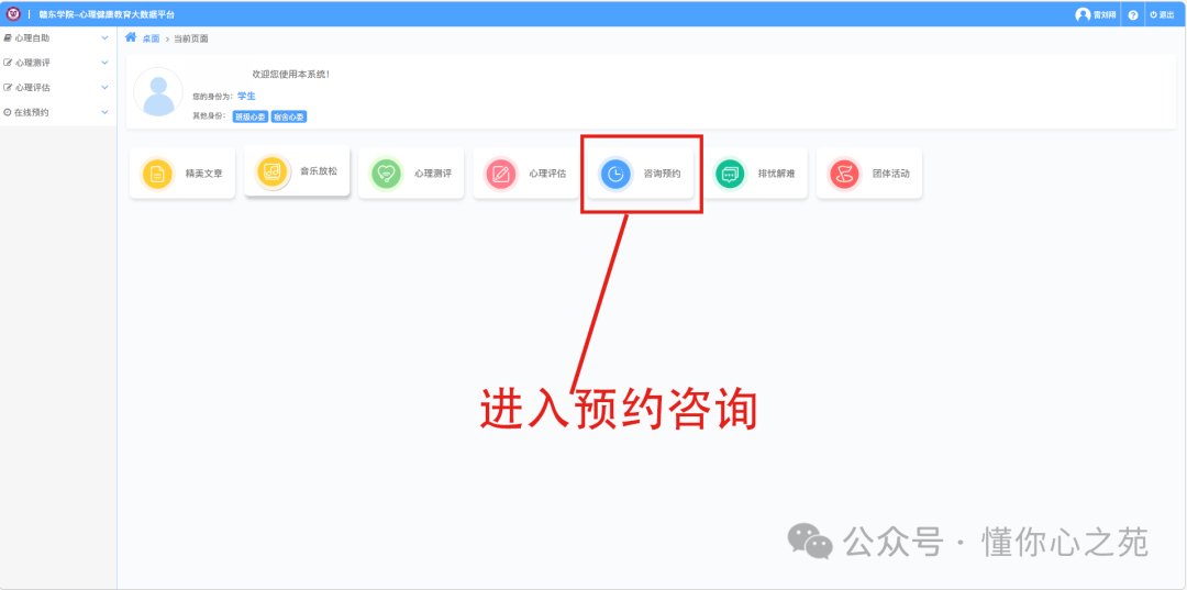 打开“赣东学院 - 心理健康教育大数据平台”根据流程提示完成预约。