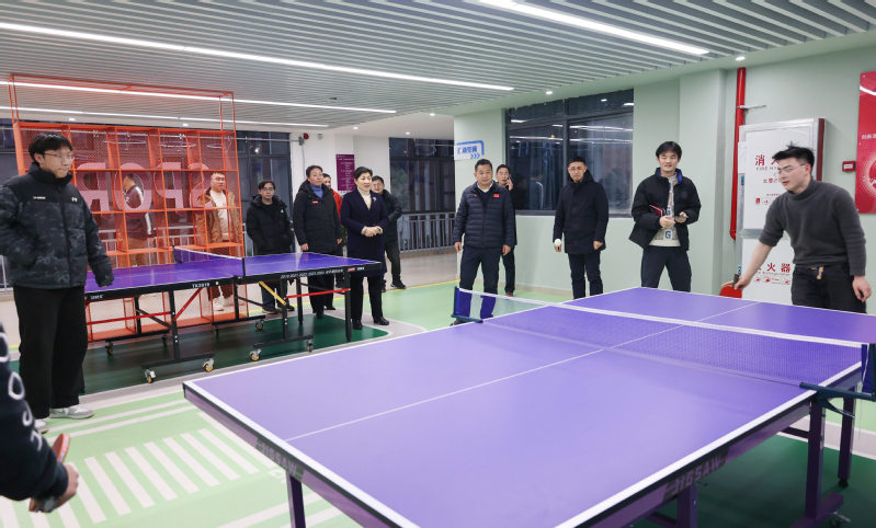 校领导一行还实地考察了学生公寓内新建成的 “一站式” 社区服务空间。在运动功能区,校领导停下脚步,观看学生们打乒乓球,并与同学们互动交流。刘云海表示,强健的体魄是学业发展的根基。鼓励学生们充分利用课余时间加强体育锻炼,培养团队协作精神。